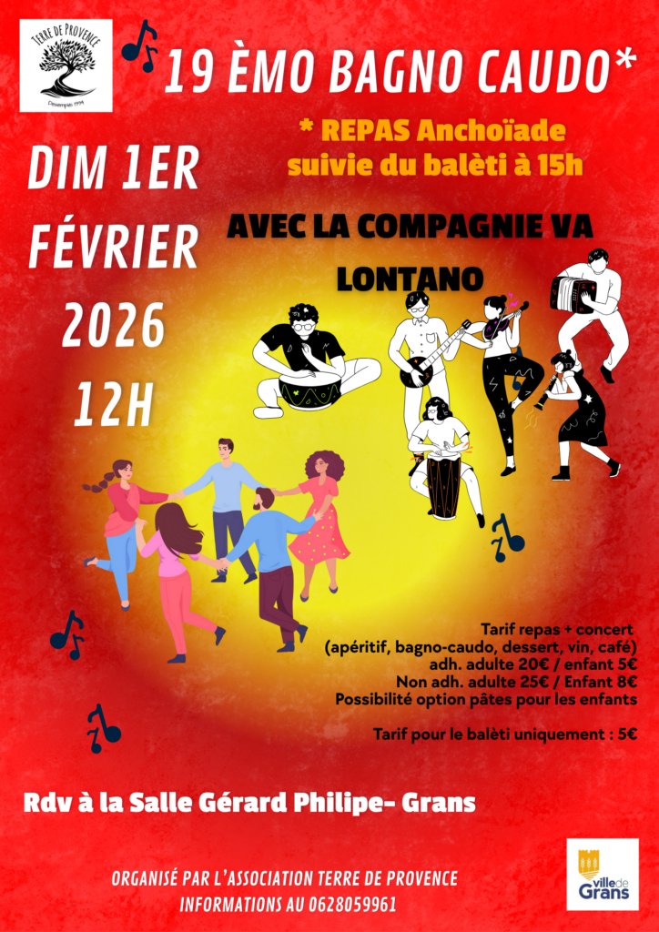 L’association Terre de Provence vous donne rendez-vous, dimanche 1er février à partir de 12h, dans la salle des fêtes pour le traditionnel repas Anchoïade, suivi du baleti à 15h avec la compagnie Va Lontano. Renseignements : 06 28 05 99 61