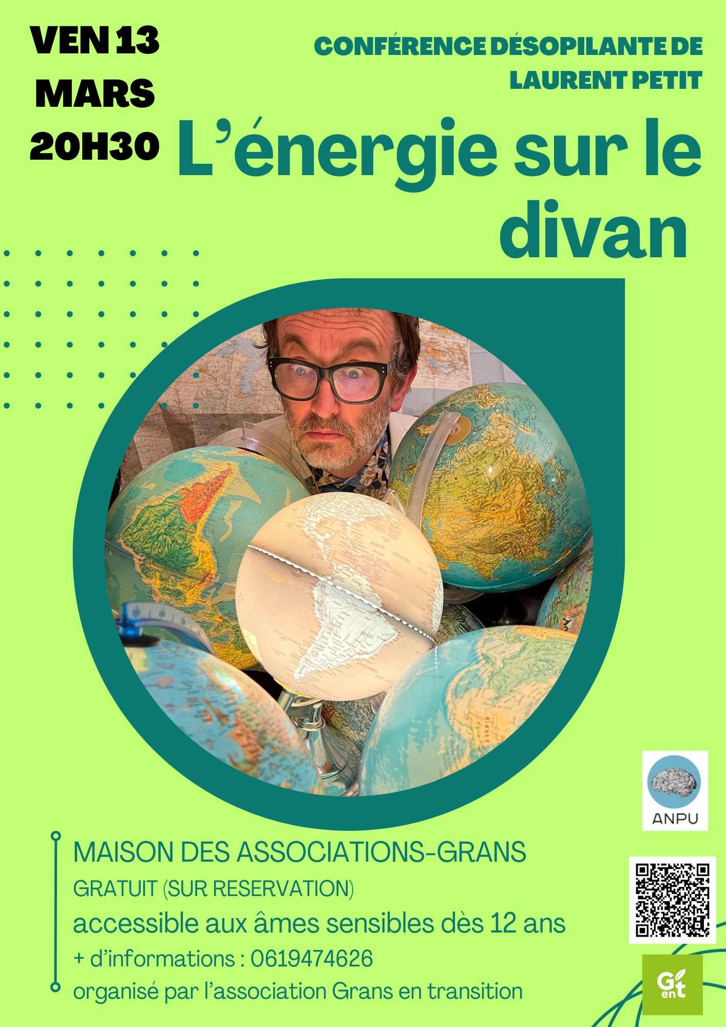 L’association Grans en Transition vous convie à une conférence désopilante et décalée de Laurent Petit, intitulée L’Énergie sur le divan. Rendez-vous vendredi 13 mars à 20h30 à la Maison des associations, l’entrée est gratuite.