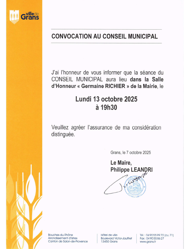 Le prochain Conseil municipal aura lieu dans la salle d’honneur Germaine Richier, lundi 13 octobre à partir de 19h30