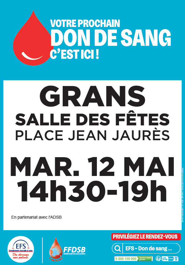 L’EFS, Établissement français du sang et l’Amicale des donneurs de sang bénévoles de Grans organisent une collecte de sang, mardi 12 mai, de 14h30 à 19h, dans la salle des fêtes. L’occasion de rappeler que donner son sang c’est sauver des vies. Chaque don peut ainsi aider jusqu’à trois personnes.