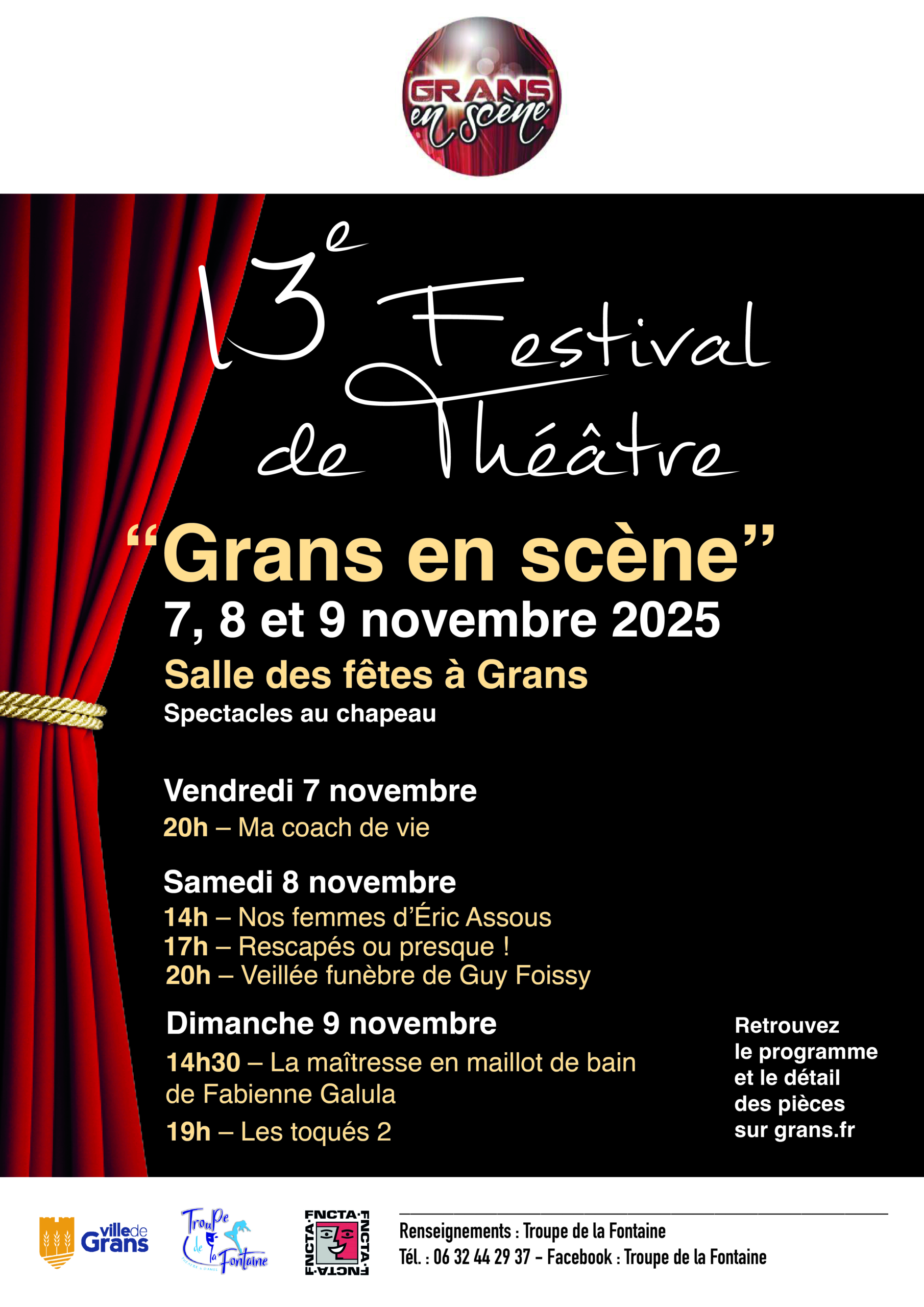 Pour sa 13è édition, le festival de théâtre Grans en Scène, organisé par La Troupe de la fontaine, revient du 7 au 9 novembre à la salle des fêtes, avec pas moins de 6 représentations. Cette année, l’humour, sous toutes ses formes, est à l’honneur.