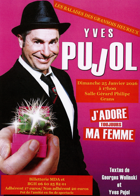 Rendez-vous dimanche 25 janvier 2026 à 17h à la salle des fêtes Gérard Philippe afin d’assister à la représentation d’Yves Pujol avec son spectacle “J’adore toujours ma femme”. Textes de Georges Wolinski et Yves Pujol.