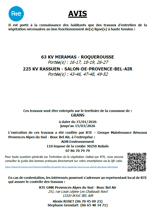 Des travaux d’entretien de la végétation nécessaires au bon fonctionnement des lignes à haute tension sont entrepris sur le territoire de notre commune, depuis le 15 janvier et vont durer jusqu’au 15 mars 2026 par RTE, Réseau de transport d’électricité.