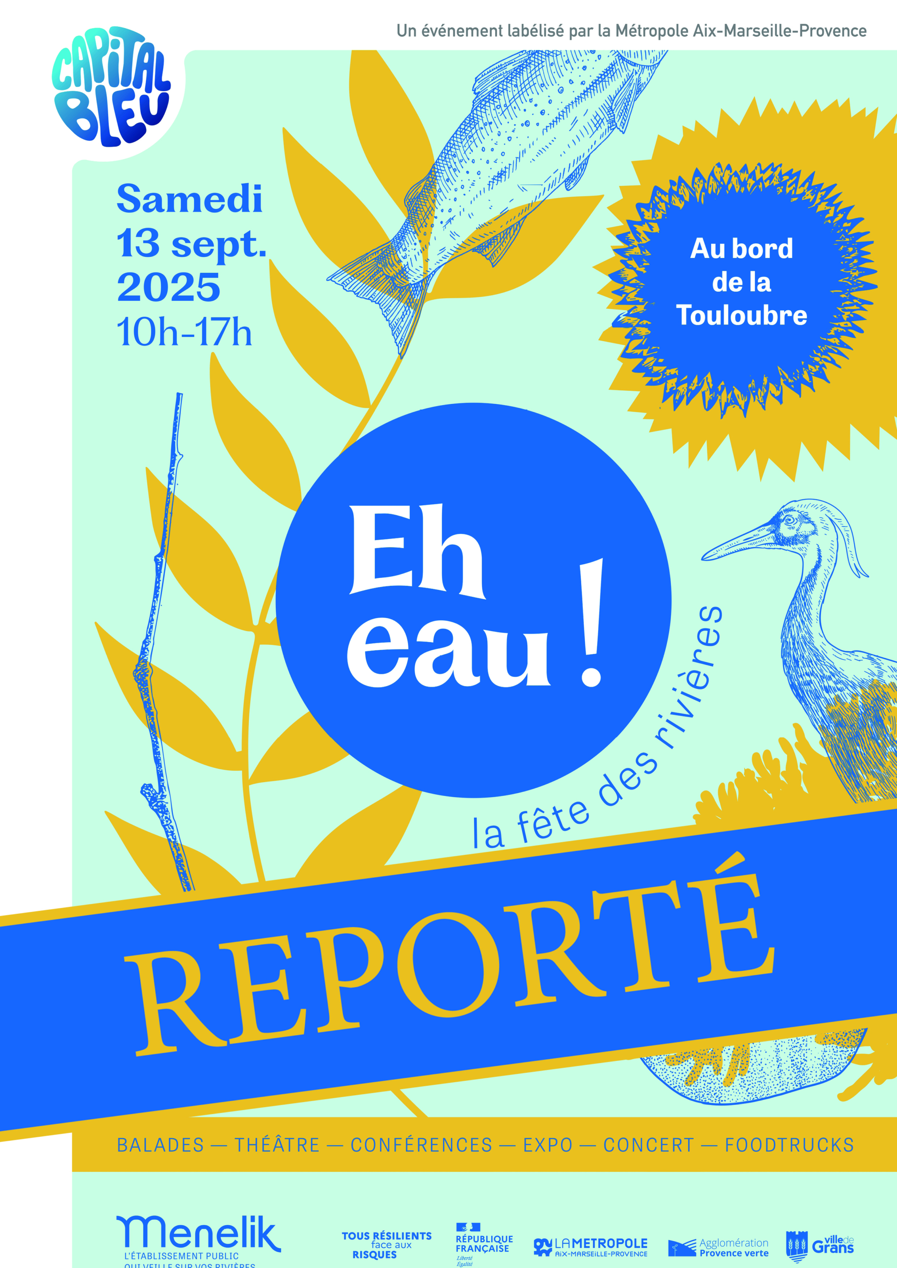 en raison des conditions météorologiques et de la pluie prévues ce samedi 13 septembre, la journée “Eh eau ! Célébrons la Touloubre” avec Ménélik est reportée au printemps prochain