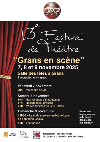 Pour sa 13è édition, le festival de théâtre Grans en Scène, organisé par La Troupe de la fontaine, revient du 7 au 9 novembre à la salle des fêtes, avec pas moins de 6 représentations. Cette année, l’humour, sous toutes ses formes, est à l’honneur.