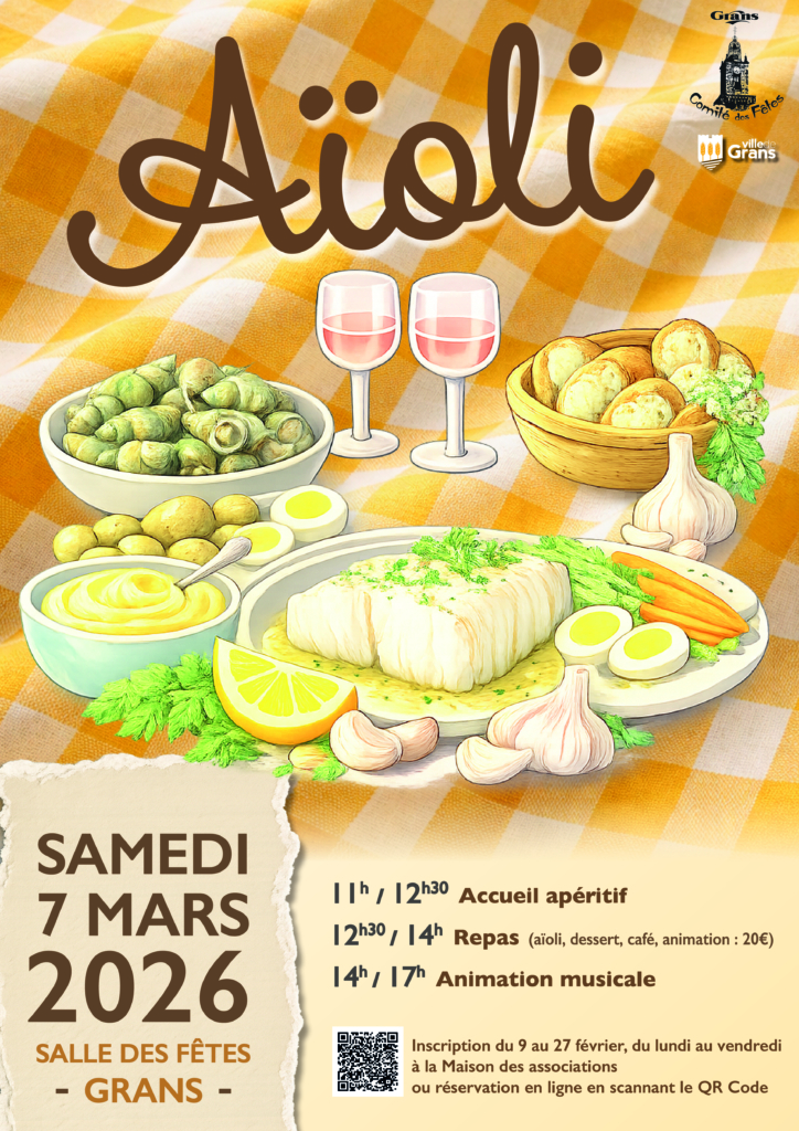 Vous souhaitez être parmi les chanceux à participer à l’évènement ? Réservez sans plus tarder votre place du 9 au 27 février à la Maison des associations ou via le lien : https://www.helloasso.com/associations/comite-des-fetes-de-grans/evenements/aioli-2026