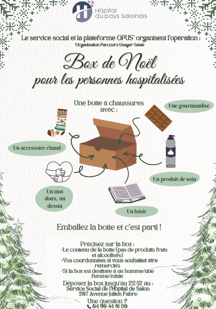 Une belle opération menée par l’hôpital du pays salonais, avec le service social et la plateforme Opus qui organisent l’opération “Box de Noël pour les personnes hospitalisées.”