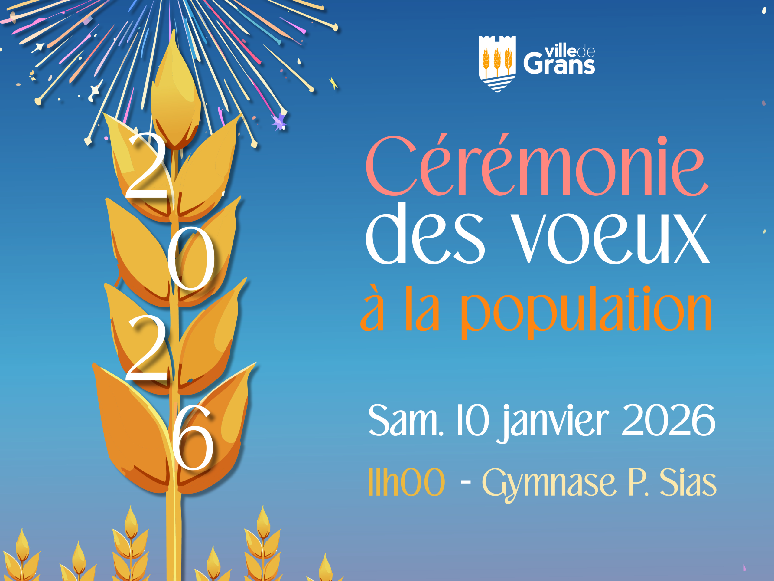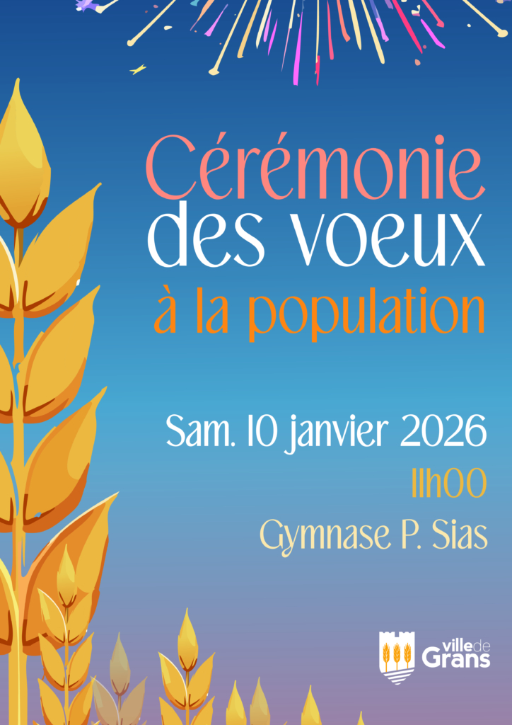 Le maire de Grans, le Conseil municipal ainsi que le Conseil municipal des jeunes ont le plaisir de vous convier à la cérémonie des voeux du maire à la population, organisée samedi 10 janvier à 11h au gymnase Paul Sias.
