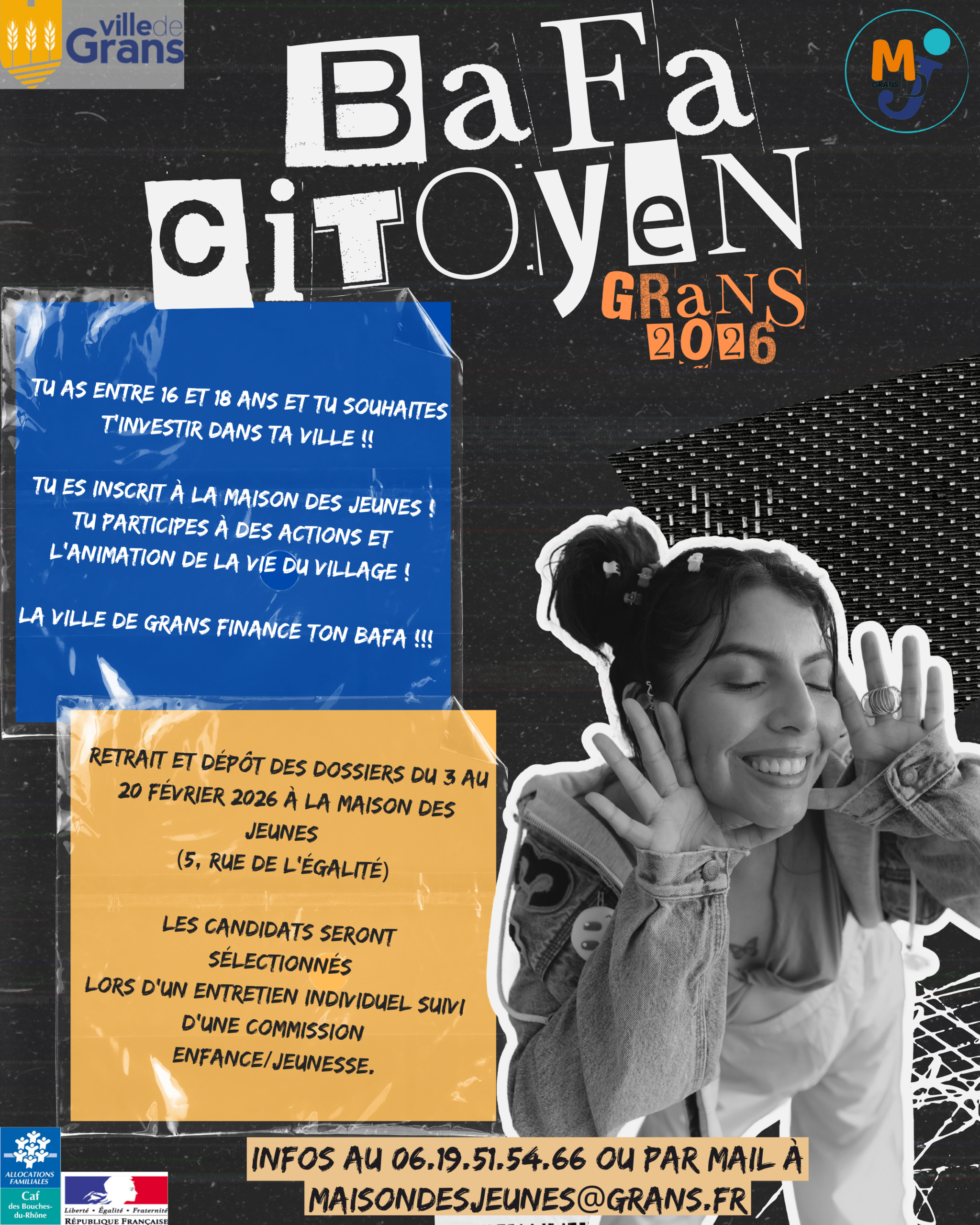 Tu as entre 16 et 18 ans et tu souhaites t’investir dans ta ville. Tu es inscrit à la Maison des Jeunes et tu participes à des actions et à l’animation de la vie du village ! La ville de Grans finance ton BAFA !